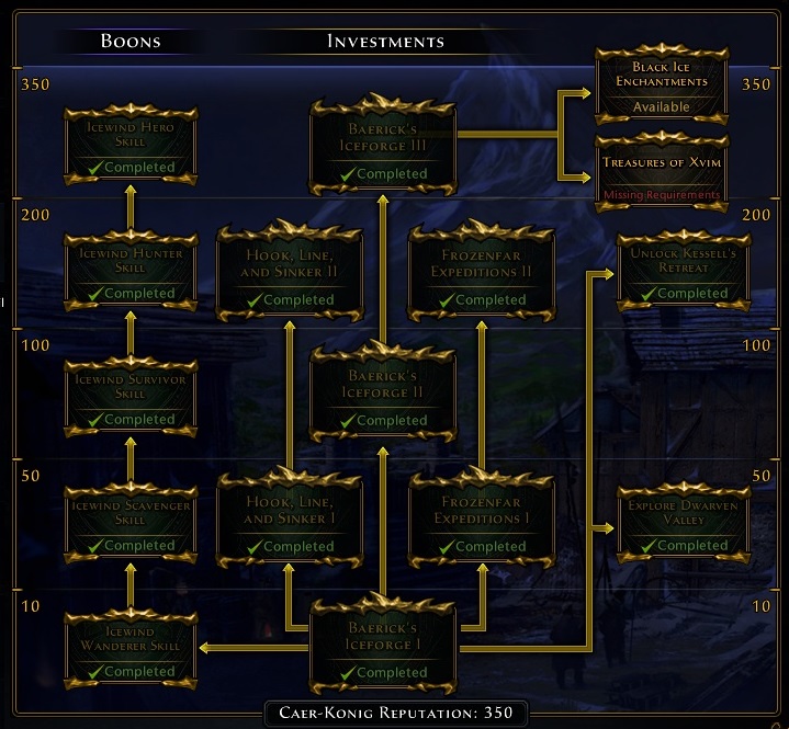 V této větvi kampaně můžete "investovat" do třech různých podniků ve městě Caer Konig - do kovárny (Baerick's Iceforge), hospody (Hook, Line and Sinker) a společnosti lovců kožešin (Frozenfar Expedition). Každý z podniků vám za vaše náklady nabídne jiný typ odměn.