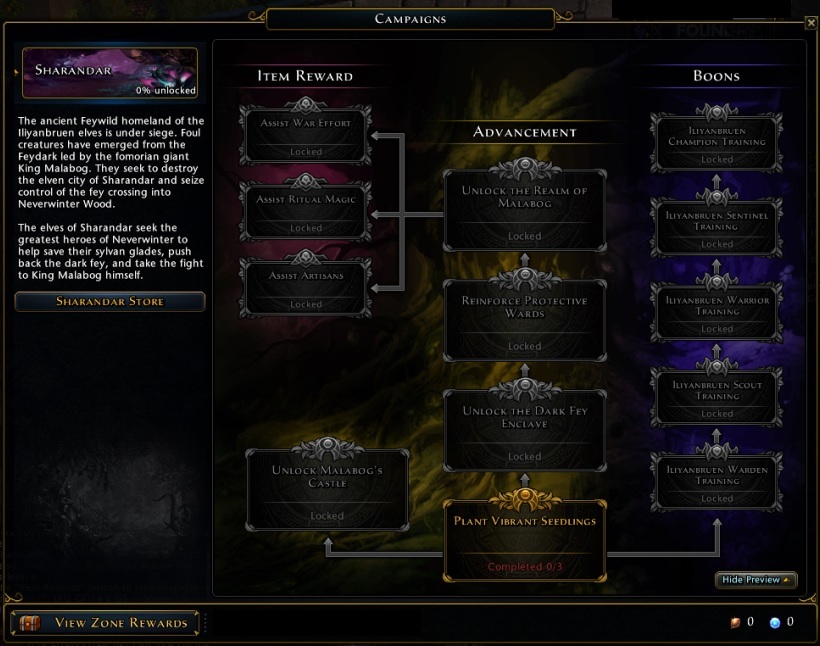 První dostupnou kampaní je Sharandar. Účast v tomto systému vám přinese postupné otevření celé nové zóny Sharandar, vstup do nového dungeonu Malabog's Castle, 5 pasivních skillů (boonů), speciální enchantmenty, companiona a vybavení související s dějem prvního modulu Fury of the Feywild.
